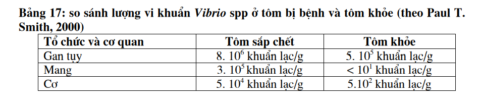 - Khi so sánh lượng khuẩn lạc giữa tôm bệnh và tôm khỏe ở các bộ phận: