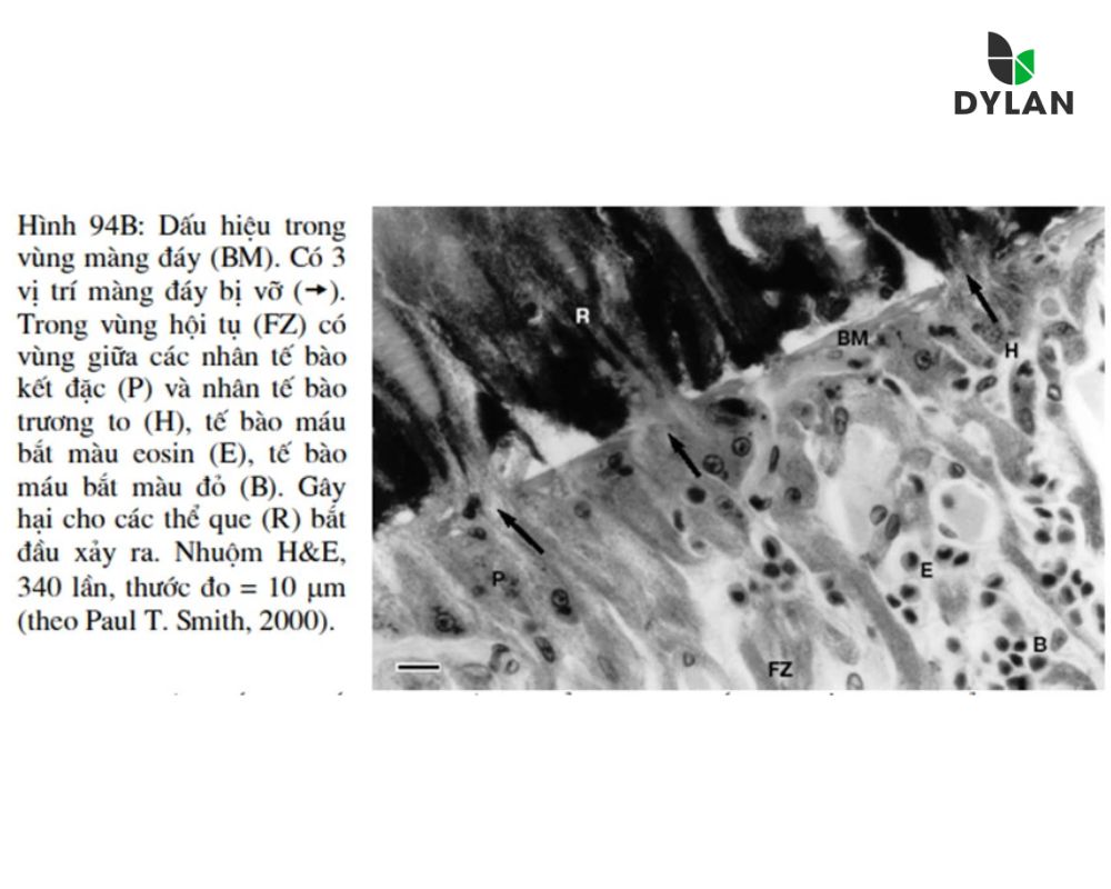 Những đặc điểm bệnh virus ở mắt được thể hiện như: mô bệnh của mắt tôm sắp chết thấy rõ sự phồng rộp và chứng phù trong hạch mỏng và các vùng hội tụ. Dấu hiệu quan sát ở vùng hội tụ và di chuyển qua màng đáy, hình dạng bình thường làm hàng rào chắn huyết tương và tế bào máu. Kiểm tra vùng xung quanh thấy rõ tế bào thoái hóa, suy thoái và hoại tử . Một số tế bào máu bị kích thích bắt màu eosin, một số khác bắt màu hồng. Một số nhân tế bào vùng hội tụ trương to, màu xanh tái hoặc bắt màu eosin nhẹ. Thấy rõ sự phá vỡ cấu trúc hình que và các tế bào bị kích thích có trong dải trong suốt.