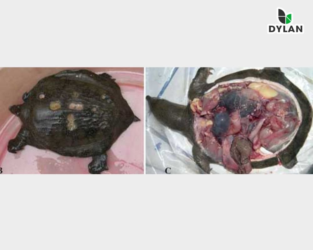 - Ở ba ba xuất hiện các vết loét xuất huyết, không có hình dạng nhất định ở xung quanh và trên mai lưng; phần bụng; các chân có thể cụt hết móng. Bệnh nặng cơ thể ba ba mềm nhũn hoạt động chậm chạp, khi lật ngửa ba ba không tự lật sấp lại được. Ba ba ít ăn hoặc bỏ ăn, sau 1-2 tuần chúng bò lên cạn và chết, tỷ lệ chết tới 30-40%. Giải phẫu phổi, gan, thận có màu đen.