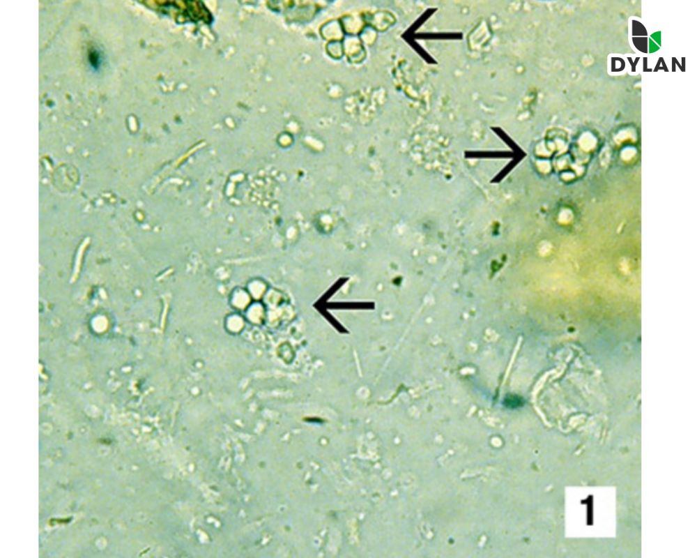 Hình 3. Trong phân tôm mắc bệnh MBV quan sát dưới kính hiển vi xuất hiện các thể ẩn MBV nhìn thấy được có hình tròn, khúc xạ ánh sáng, đơn độc hoặc xuất hiện thành cụm, thể ẩn MBV trong cụm dính với nhau bởi màng nhân. Thêm malachite green 0,1% , thể ẩn bắt màu xanh đậm hơn các phần khác.