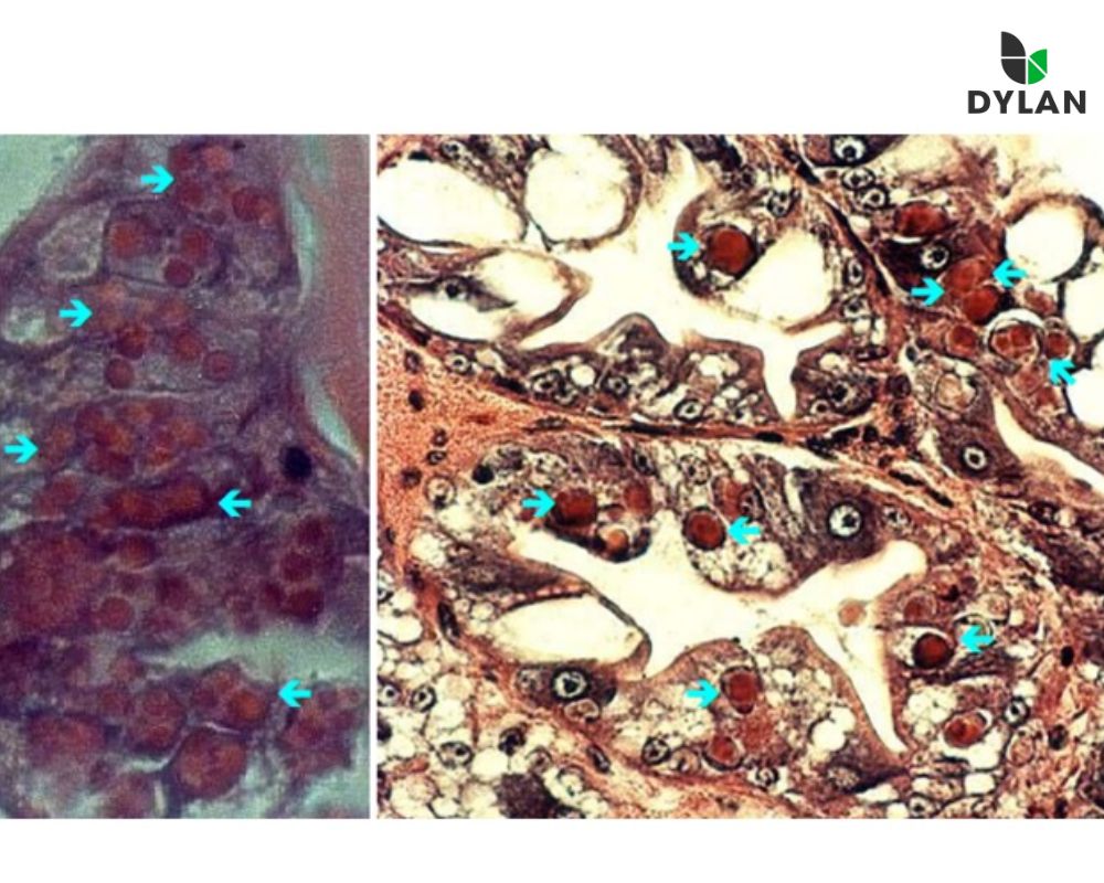 Hình 2.Gan tụy tôm sú nhiễm bệnh MBV, các thể ẩn (è) màu đỏ, nhân màu xanh tím, nhuộm màu H&E (X400).